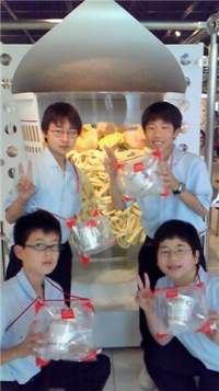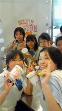 カップにフタをし、袋に入れればオリジナルカップラーメンの出来上がり!大きなカップラーメンの模型前で記念撮影です。賞味期限は今日から1ヶ月だそうです。帰ってから食べるのが楽しみですね。