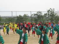 体育科の山尾先生を中心に、中3が作り上げた団体行動と開智よさこい。3年生の堂々とした演技に、下級生からは「すごい」「かっこいい」という言葉があふれていました。中3学年団の先生も一緒になって踊ります。
