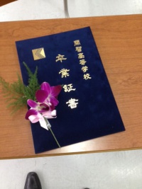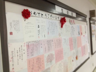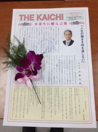 2014年03月03日 | 中等部(4‐6年)・高等部 卒業証書授与式(2) 卒業新聞「THE KAICHI」 1階玄関前には、お祝いに頂きました多くの電報を披露させていただいております。本当にありがとうございました。 卒業証書授与式の後は、各教室に入って最後のホームルームです。THE KAICHI(画像左)と卒業アルバムが配られました。