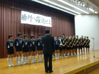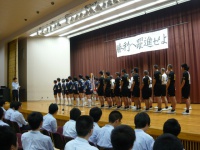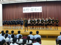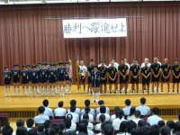 校長先生からは、平常心を持ち、練習で培った力を出し切ってきてほしい、生徒会長からは全校生徒の代表、県予選で悔しい思いをしたクラブ生の分まで頑張ってきてほしいと、激励の言葉がありました。