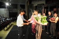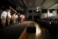 関西芸術座さんの控え室(作法室)にて、近藤校長先生から劇団員の方々へのお礼の挨拶です。