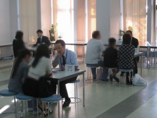 画像は、全体会の後に生徒ホールで行われた個別相談会の様子です。入試に関すること、教育の内容、クラブ活動に関することなどいろいろと相談を受けました。