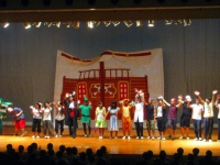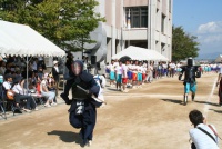 画像は剣道部と演劇部が重いものをつけて頑張って走っています。第一位はなんと飛び入り参加の教員チームでした。