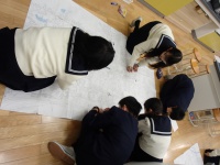 生徒たちは地図を見ながら、ここは池や川が近いから危ない、避難時はこの公園が使える、など討論しながら地図に書き込んでいました。