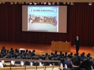 2013年11月14日 外務省「高校講座」 本日1・2限目は中4~5・高1~2を対象に、外務省 国際協力局で勤務されている、河本 健志氏をお招きし、貴重な経験談やODA(政府開発機構)についてお話していただきました。 質疑応答も活発で、まだまだお話を伺いたいところでしたが、河本さんオススメの本を紹介しますので後学に役立ててください。 1、外交官の仕事がわかる本 ・城田安紀夫「外交官」 2、ODAについて ・池上彰「世界を救う7人の日本人 国際貢献の教科書」