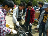 まずは、バーベキュー台のセッティングです。強風が吹く中での火おこしは難しく苦労しましたが、各班工夫をしながらなんとかつけられました。