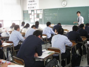 画像は高校2年生の生物の授業です。教室左上には、早くも「一致団結し、けじめをつけて全員合格」という張り紙が見られますね。