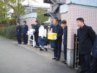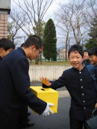 この冬一番の寒さといわれる中、手作りの募金箱を持ち、生徒会役員は元気よく