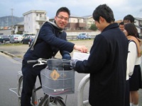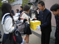 自転車に乗って通学してきた生徒も、自転車を止め、こころよく募金に協力してくれました。