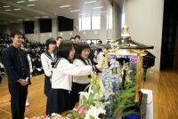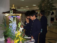 2007年05月08日 | 全校 今日は花まつりの音楽法要を行います 花まつりは仏教を開かれたお釈迦様の誕生をお祝いする行事です。 本来は、4月8日に行われるこの行事は「灌仏会(かんぶつえ)」「仏生会(ぶっしょうえ)」とも呼ばれています。 この画像は、生徒たちが誕生仏の頭から甘茶をそそぐ「灌頂(かんじょう)」を行っている様子です。 この花御堂(はなみどう)を作るのは、お釈迦様のお生まれになった場所、ルンビニーの花園を表しています。 玄関ホールに花御堂を置き、誕生仏を安置しています。 生徒たちは誕生仏の頭から甘茶をそそぎ、手を合わせて願い事をしております。
