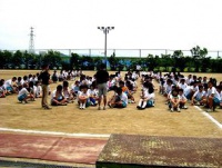 12時55分にグラウンドに集合し、諸注意と準備体操をしました。教育実習生の山本先生が準備体操を指導してくれました。