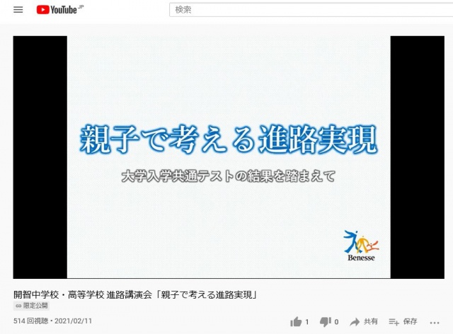 2021年02月14日(日) 育友会活動 進路講演会 進路専門委員会の進路講演会「親子で考える進路実現」のYouTube配信が2月13日(土)から始まっています。 例年は講師の方をお招きして開催しておりますが、本年度は、新型コロナの影響によりYouTubeでの配信となりました。 視聴期間は2月13日(土)~28日(日)です。ぜひご覧ください。