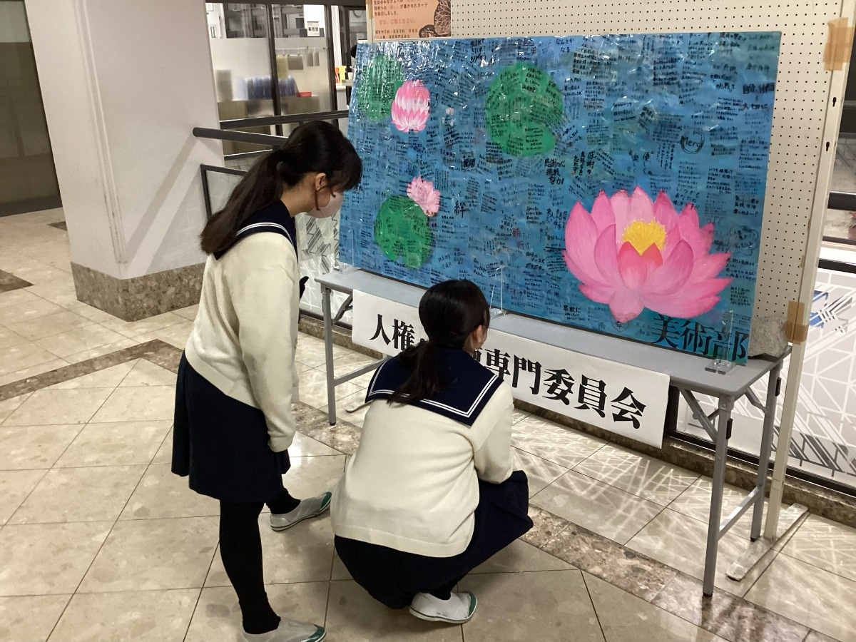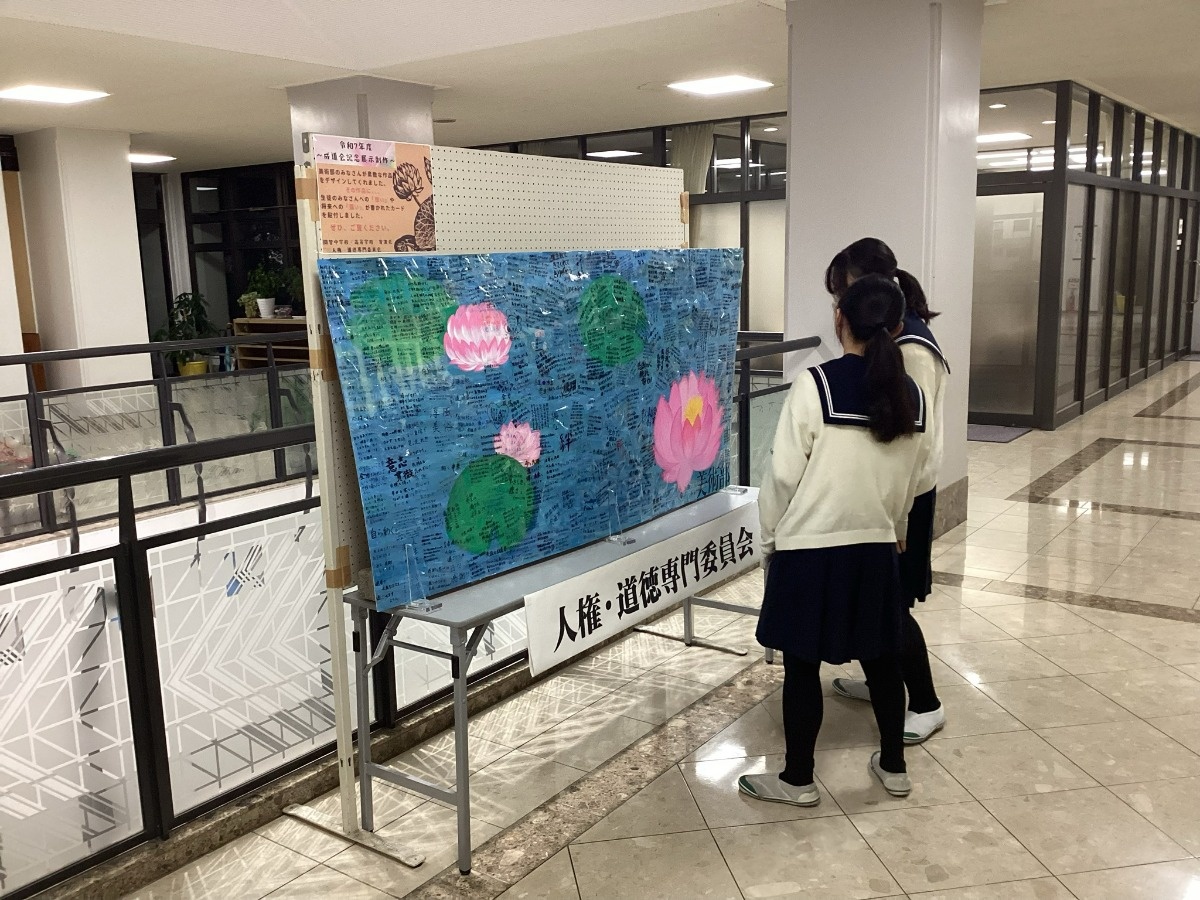 成道会にあわせて事務室前の廊下に展示しておりました、人権・道徳専門委員会による記念展示は、先日無事に終了し、年末まで中学校棟玄関に展示しています。美術部の生徒が心を込めて描いた蓮の花の絵に、保護者の皆さまから寄せられた温かなメッセージが重なり合い、廊下を行き交う多くの生徒の足を止める展示となりました。静かに板の前に立ち、じっと絵や言葉に目を向ける生徒の姿からは、それぞれが何かを感じ取っている様子がうかがえました。