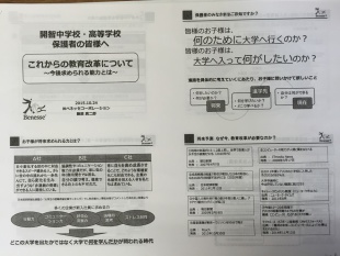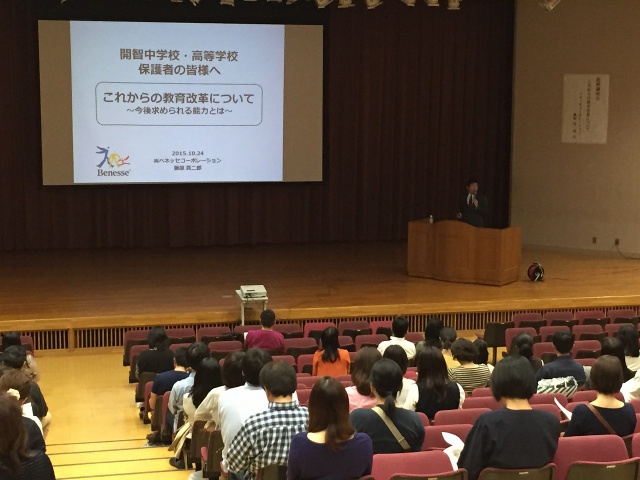 2015年10月24日(土) 育友会活動 育友会進路専門委員会講演会 10月24日(土)育友会進路専門委員会による講演会が行われました。 演題 「これからの教育改革について 今後求められる能力とは」 講師 藤原 真二郎 氏 (株式会社 ベネッセコーポレーション)