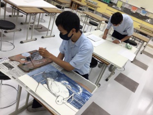 美術と言っても表現の仕方は絵を描くことだけではありません。美術部では、基礎的な技術指導はもちろん、1人1人の得意分野や興味に合った表現を共に探します。また、表現の幅を広げるためにも、友達の作品や、展覧会の作品などからアイデアを吸収したことを作品に還元するというサイクルを大切にしています。