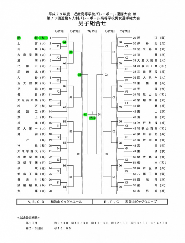 2017年06月24日(土) 男バレ最新ニュース < 男子チーム紹介 < バレーボールだより < 学校生活 【近畿大会】組み合わせ決定! 日時:7月20日(木)-23日(日) 会場:和歌山ビッグホエール・ビッグウェーブ 初戦:7月21日(金)第4試合(12:30) vs.上宮(大)と山崎(兵)の勝者 応援よろしくお願いします。