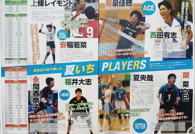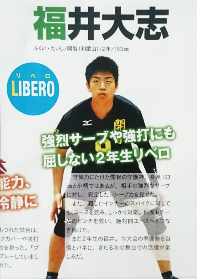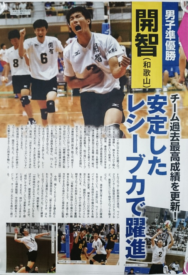 2017年08月19日(土) 男バレ最新ニュース < 男子チーム紹介 < バレーボールだより < 学校生活 月バレ(9月号)に載りました! 月刊バレーボール(9月号)にインターハイ特集が組まれており、今大会で準優勝した開智高校が掲載されました。 また、大会中に輝いたプレイヤーを発掘するコーナーではリベロの福井大志(2年・明和中出身)が取り上げていただきました。 ちなみに、先日宣伝させていただいた「ちちんぷいぷい(毎日放送)」は8月21日(月)に放送されます。 “学校へ行こッ!”のコーナーは17時頃だと思いますので、そちらも合わせてご覧ください!