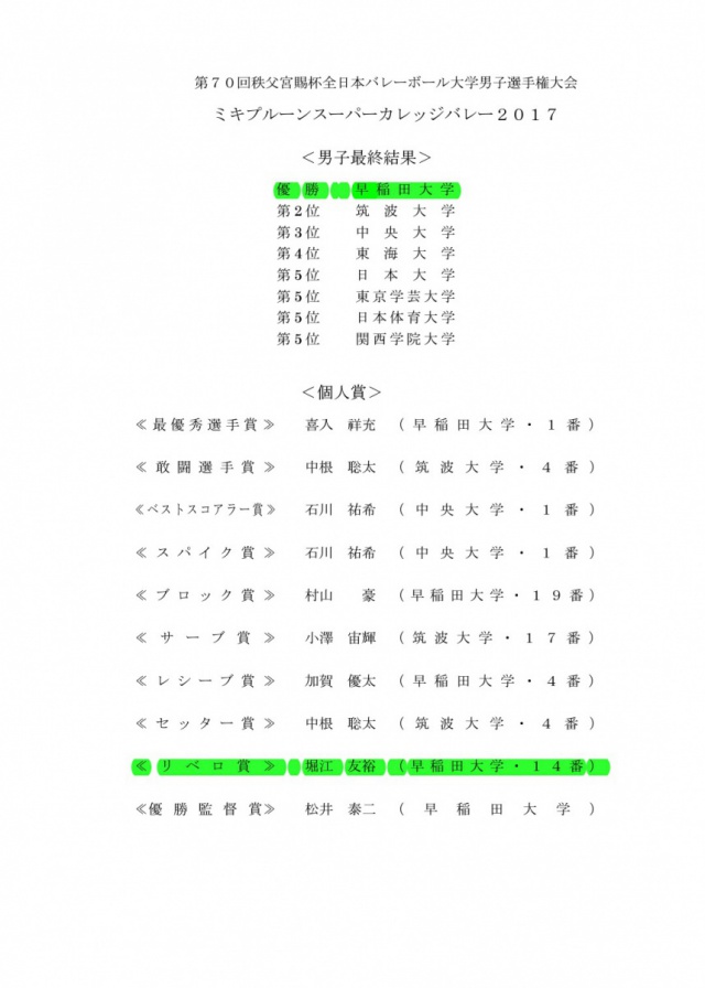 大田区総合体育館(東京)を中心に「第70回秩父宮賜杯全日本バレーボール大学男子選手権大会 ミキプルーンスーパーカレッジバレー2017(通称:全日本インカレ)」が開催されていました。