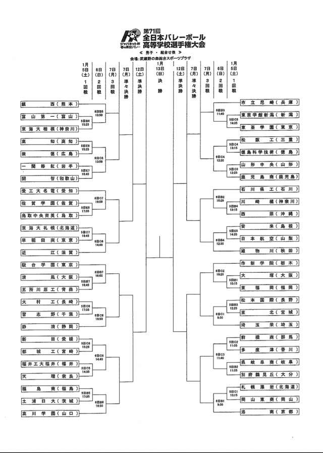 2018年12月02日(日) 男バレ最新ニュース < 男子チーム紹介 < バレーボールだより < 学校生活 【春高バレー】組み合わせ決定! 1月5日(土)から武蔵野の森総合スポーツプラザ(東京)にて開催される、全日本バレーボール高等学校選手権大会(通称:春の高校バレー)の抽選会が本日行われました。 日時:1月5日(土) 第7試合(16:45) 場所:武蔵の森総合スポーツプラザEコート 相手:一関修紅(岩手)