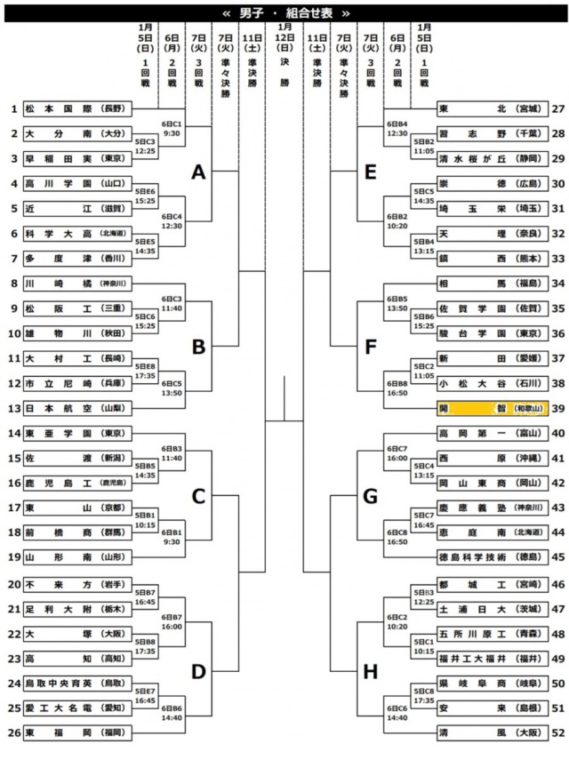 2019年12月02日(月) 男バレ最新ニュース < 男子チーム紹介 < バレーボールだより < 学校生活 【春高バレー】組み合わせ決定! 1月5日(日)から武蔵野の森総合スポーツプラザ(東京)にて開催される、全日本バレーボール高等学校選手権大会(通称:春の高校バレー)の抽選会が昨日行われました。 日時:1月6日(月) 第8試合(16:50) 場所:武蔵野の森総合スポーツプラザ Bコート 相手:新田(愛媛)と小松大谷(石川)の勝者