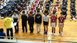 堺ブレイザーズ主将の石島選手(通称ゴッツ)から記念品を受け取っています。