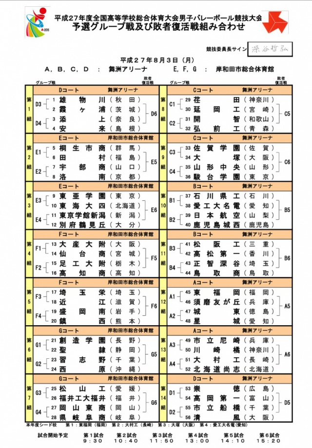 2015年07月05日(日) 男バレ最新ニュース < 男子チーム紹介 < バレーボールだより < 学校生活 【インターハイ】グループ予選・組み合わせ決定! 8月3日(月) 舞洲アリーナCコート 第2試合目(10:40) vs.弘前工(青森) 日本一への第一歩目。 初戦であれ、決勝戦であれ、ブレずに自分たちの力を出し切りたいと思います。 開智カラーを最後まで出し続けられるか?!挑戦者の気持ちで優勝狙います! 応援よろしくお願いします☆