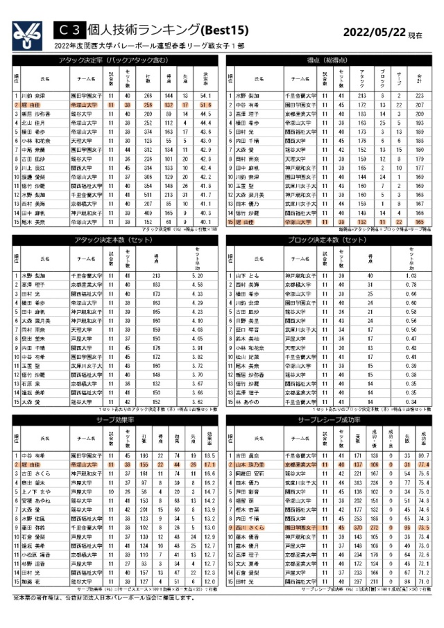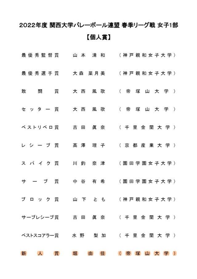 2022年05月27日(金) 女バレ最新ニュース < 女子チーム紹介 < バレーボールだより < 学校生活 OG堀由佳選手 新人賞 受賞! 令和3年度卒 堀由佳(貴志川中→開智高→帝塚山大1回生) →所属チーム 準優勝 個人賞 新人賞受賞 アタック決定率 2位 サーブ効果率 2位 得点(総得点) 15位 他にも… 平成30年度卒 山本珠乃里(和歌山東中→開智高→京都産業大4回生) →サーブレシーブ成功率2位 令和 3年度卒 西川さくら(和歌山東中→開智高→園田学園女子大1回生) →サーブレシーブ成功率9位 上記以外の先輩たちも、方々で頑張っています。 負けるな、高校生!!
