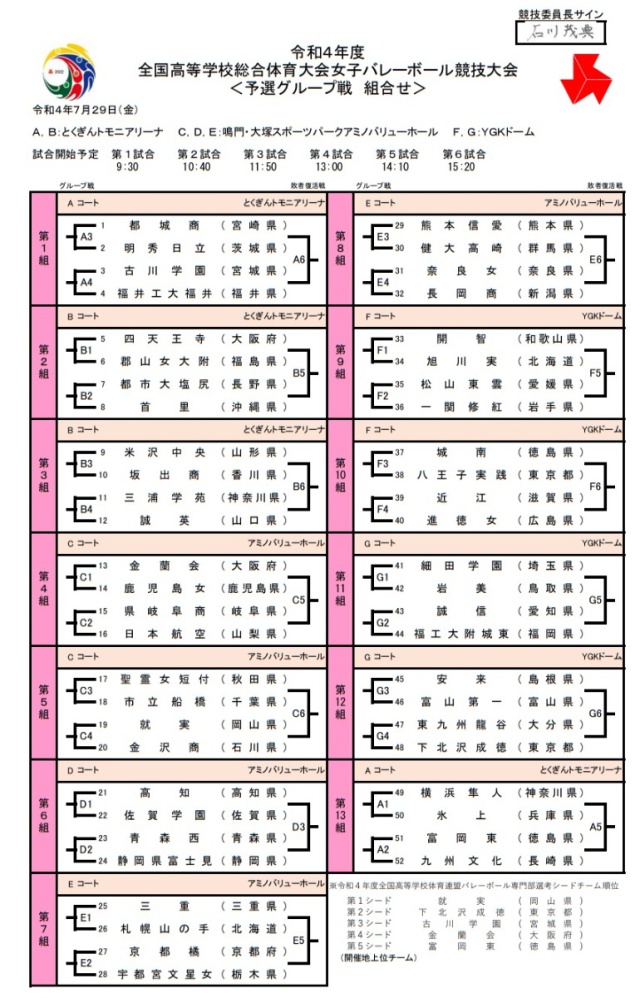 2022年07月08日(金) 女バレ最新ニュース < 女子チーム紹介 < バレーボールだより < 学校生活 【インターハイ】組み合わせ決定!! 〔予選グループ 初戦〕 日時:7月29日(金)9時30分 場所:YGKドーム Fコート 相手:旭川実業(北海道) 応援よろしくお願いします!! (※有観客で開催ですが、事前に書類が必要となります。) ☆試合は【インハイ.tv】にてご覧になれます! ↓ インハイ.tv