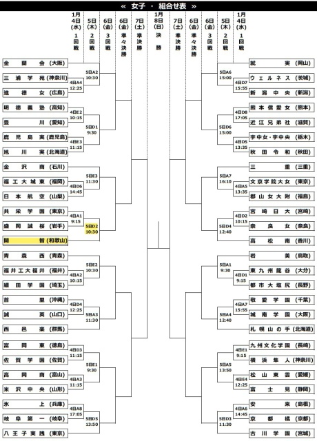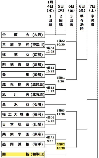 2022年12月05日(月) 女バレ最新ニュース < 女子チーム紹介 < バレーボールだより < 学校生活 【春高】組み合わせ決定!! ☆開智の初戦☆ 日程:1月5日(水)※組み合わせの関係で、1月4日は試合がありません 時間:10時30分 場所:東京体育館Dコート 相手:共栄学園(東京)と盛岡誠桜(岩手)の勝者 応援よろしくお願いします! ↑ 男女合わせたトーナメント表はこちら!