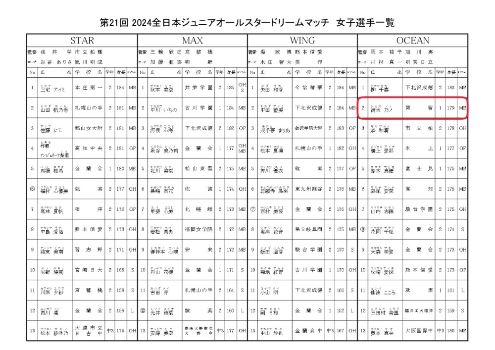 現・開智高校1年生 清水乃ノ(石尾中出身)が「2024全日本ジュニアオールスタードリームマッチ」に選出されました!