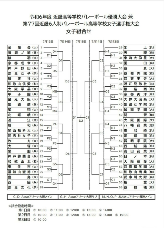 2024年07月01日(月) 女バレ最新ニュース < 女子チーム紹介 < バレーボールだより < 学校生活 【近畿大会】組み合わせ決定! 日時:7月13日(土) 場所:おおきにアリーナ舞洲 Oコート 時間:第4試合(13:00) 相手:姫路女学院(兵庫)と城南学園(大阪)の勝者 応援よろしくお願いいたします!